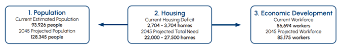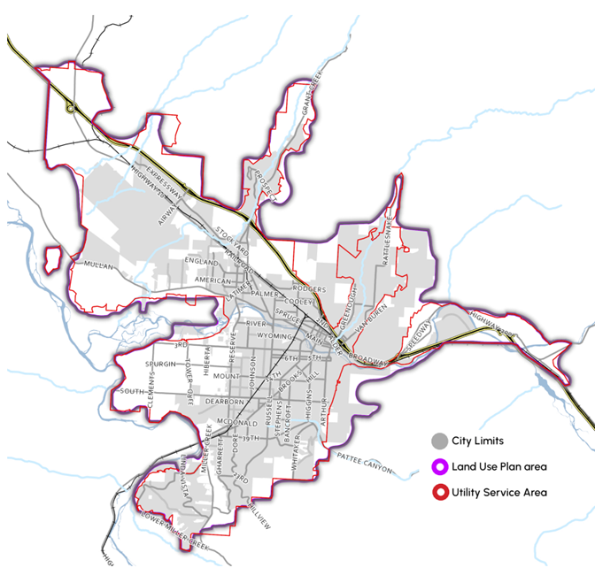 Growth projections for Missoula are included in the Our Missoula 2045 Land Use Plan. The current population for the Land Use Plan (LUP) Area is 93,926 people with a projection of 128,346 people by 2045. The LUP Area is shown on the map below. The LUP Area extends beyond the MCPS District, so some of the projected growth is planned to be accommodated by other school districts.